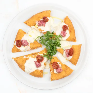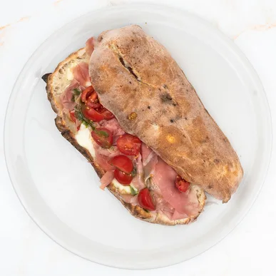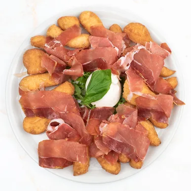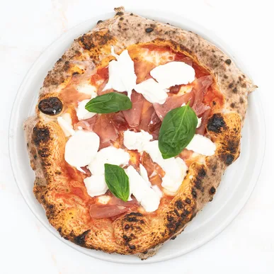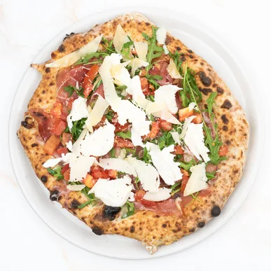 mozzarella di bufala campana DOP, pomodorino di Pachino IGP, prosciutto crudo, rucola, scaglie di Grana Padano DOP