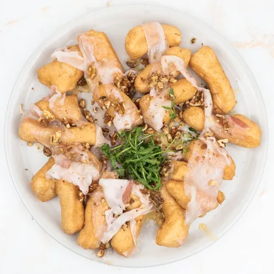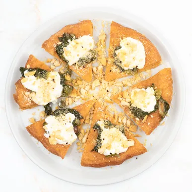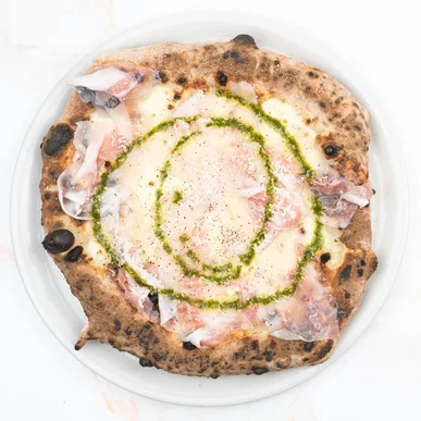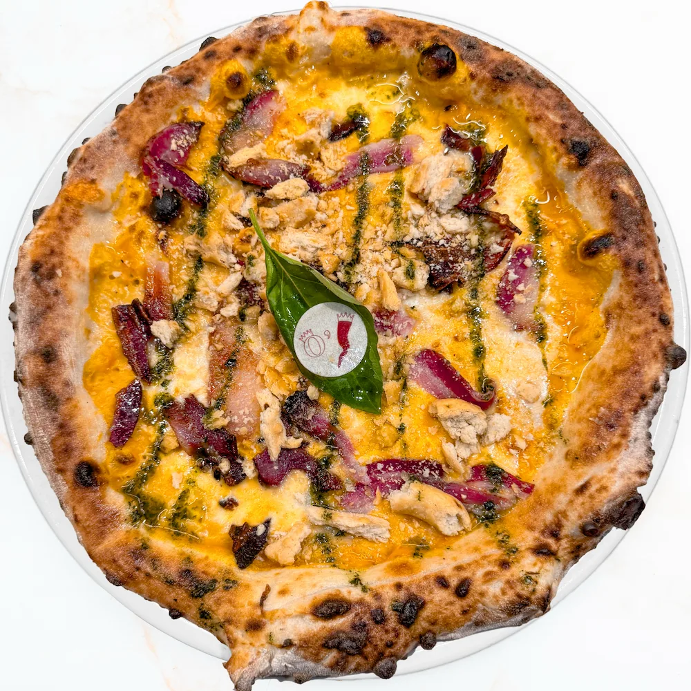 fior di latte, crema di zucca, gorgonzola DOP, bacon croccante, taralli pugliesi sbriciolati e crema di basilico
