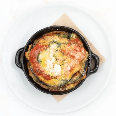 pomodori pelati San Marzano DOP, fior di latte, melanzane fritte, scaglie di ricotta salata stagionata
