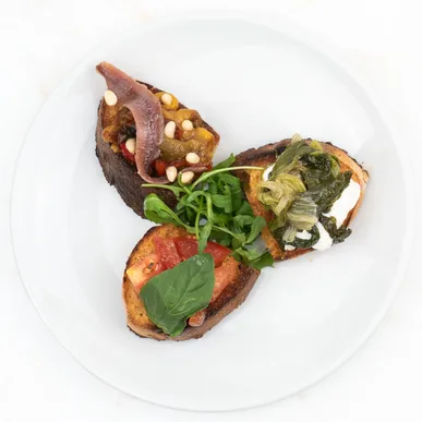 - Peperoni arrostiti, filetti di acciughe del Mar Cantabrico, pinoli