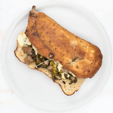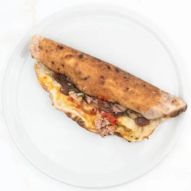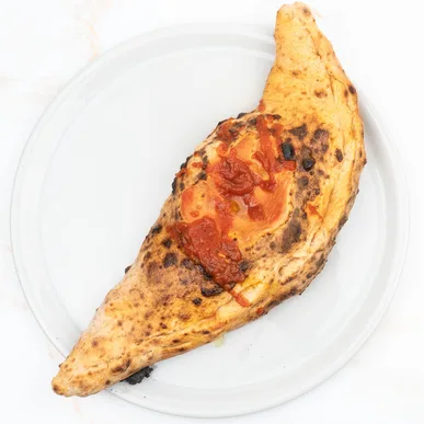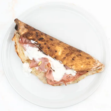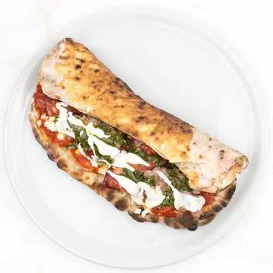cornicione ripieno di ricotta fresca, pomodoro cotto, fior di latte, crema di basilico a freddo, pepe nero
