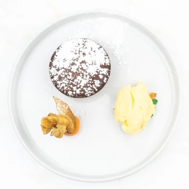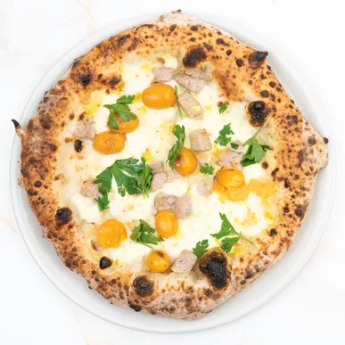 fior di latte, filetti di tonno fresco scottato, cherry gialli, aroma di alici, polvere di limone di Sorrento, prezzemolo