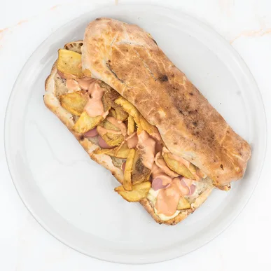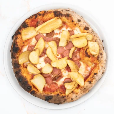 pomodori pelati San Marzano DOP, fior di latte, würstel, patatine fritte*