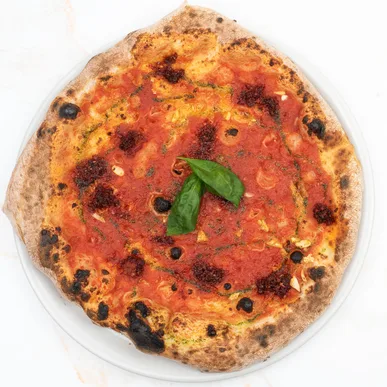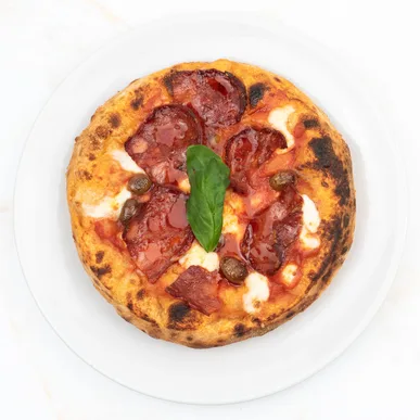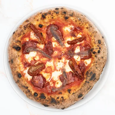 pomodori pelati San Marzano DOP, fior di latte, pomodori secchi, salame piccante, filetti di acciughe del Mar Cantabrico