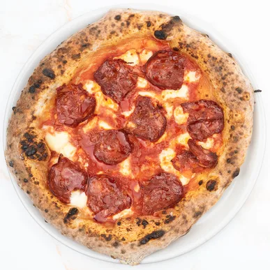 pomodori pelati San Marzano DOP, fior di latte, salame piccante, olive nere