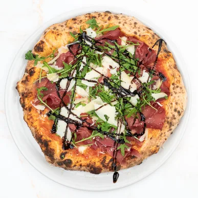 pomodori pelati San Marzano DOP, fior di latte, bresaola, rucola, scaglie di Grana Padano DOP, riduzione di aceto balsamico di Modena IGP