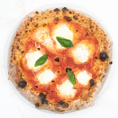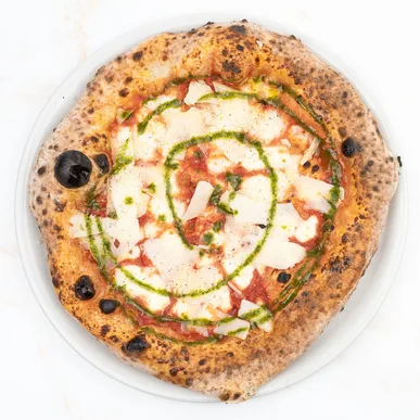 pomodori pelati San Marzano DOP, fior di latte, pecorino romano DOP, crema di basilico, pepe nero