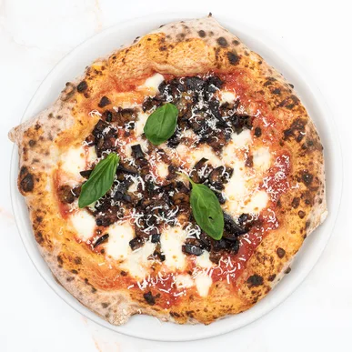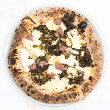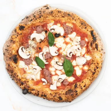 pomodori pelati San Marzano DOP, fior di latte, salsiccia, funghi champignon, pepe nero