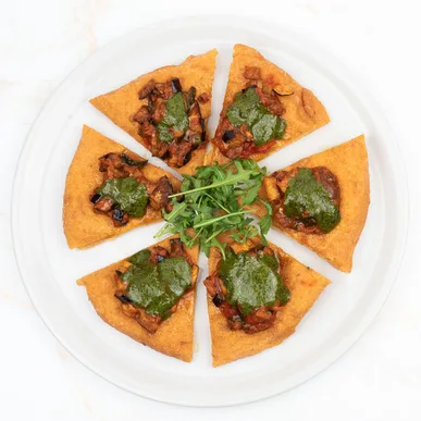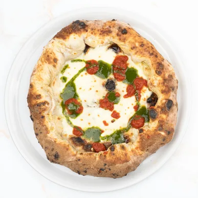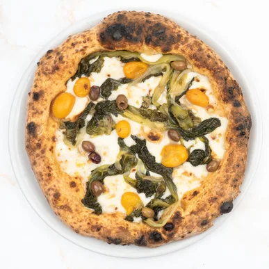 impasto speciale O’ Cuorn (leggermente piccante), provola affumicata, cherry gialli, olive taggiasche, scarola con peperoncino e pinoli