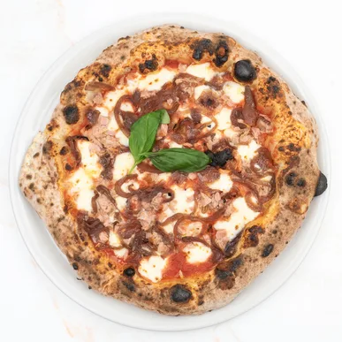 pomodori pelati San Marzano DOP, fior di latte, filetto di tonno pinna gialla, cipolla