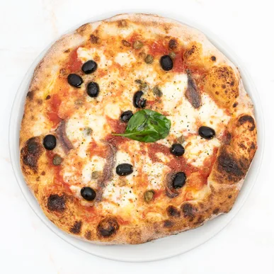 pomodori pelati San Marzano DOP, fior di latte, filetti di acciughe del Mar Cantabrico, capperi, olive