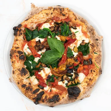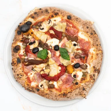 pomodori pelati San Marzano DOP, fior di latte, prosciutto cotto, olive nere, funghi champignon, cuor di carciofo sott’olio, peperoni, capperi