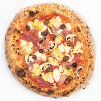 pomodori pelati San Marzano DOP, fior di latte, prosciutto cotto, funghi champignon, cuor di carciofo sott’olio, olive nere