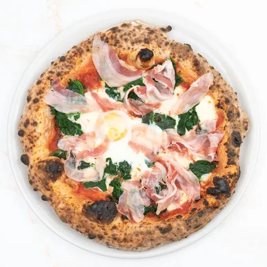 pomodori pelati San Marzano DOP, fior di latte, spinaci, pancetta, uovo