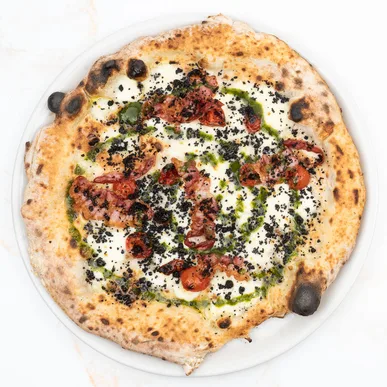 fior di latte, pomodorini confit, bacon croccante, crema di basilico, crema di stracciatella, polveri di olive